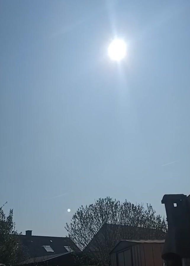 bright, sunny day. The sun is high in the clear blue sky. Below the sky, there are rooftops of houses, trees, and a chimney stack. The scene is still and quiet. There are no people visible in the frame.