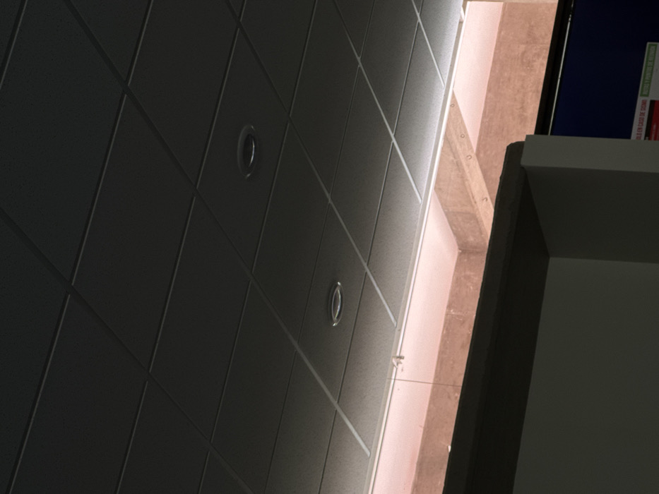 A low-angle shot looking upwards reveals a textured, tiled ceiling with recessed lighting. Beige walls are visible along the right edge of the image. A dark rectangle with a screen on the upper-right portion of the frame suggests signage or a display. The lighting creates a gradient effect, emphasizing the texture of the tiles.