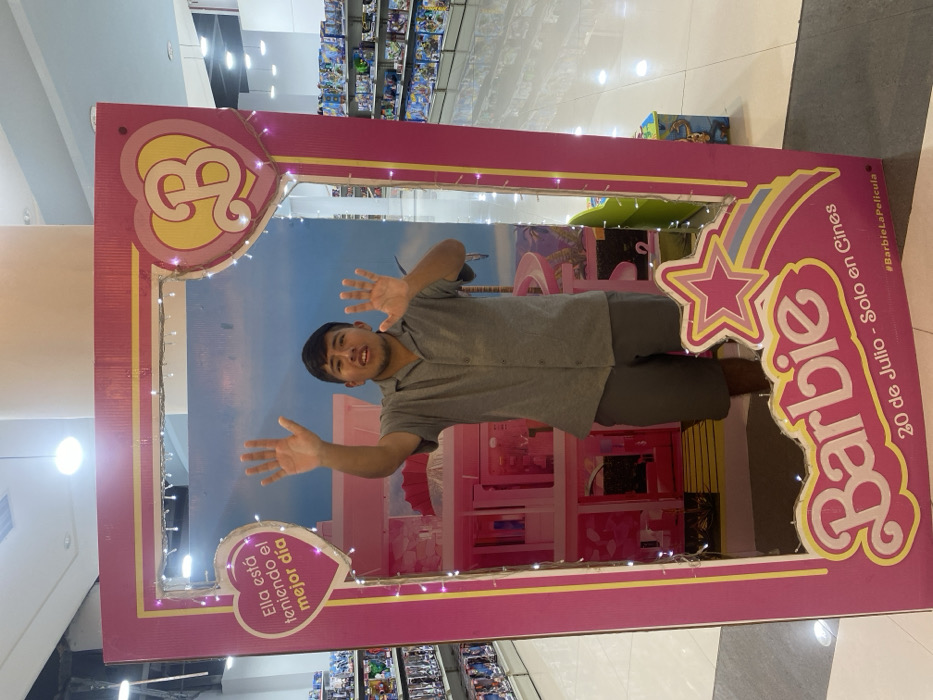 A young adult male of Hispanic or Indigenous descent is depicted from the waist up, centered within a large, pink cardboard cutout resembling a Barbie doll box