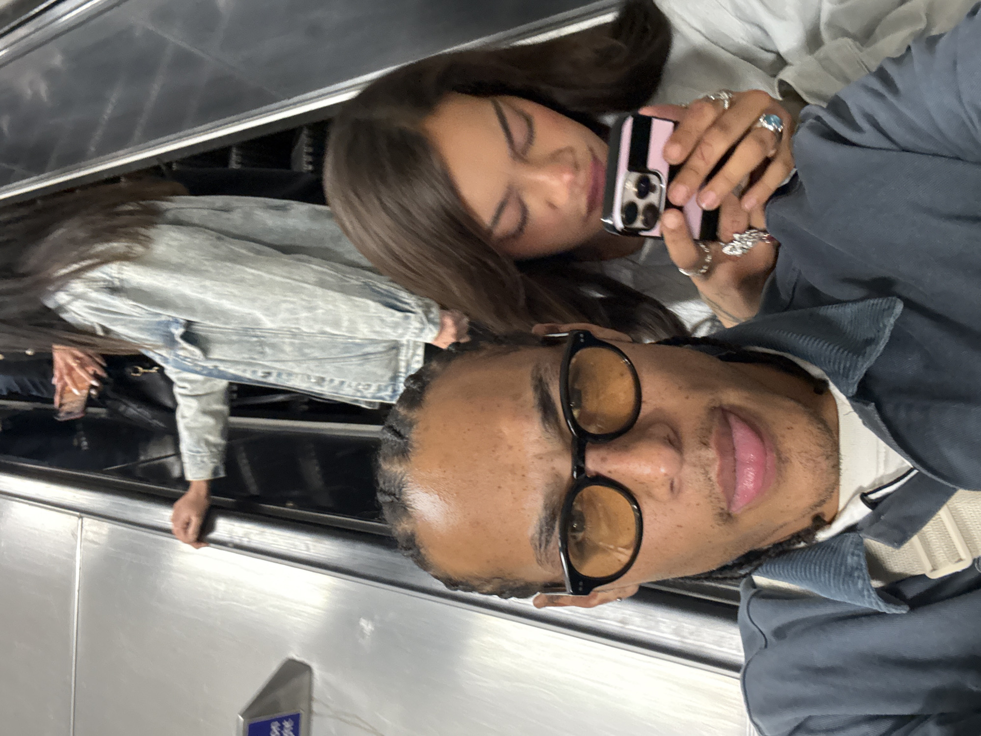 Two people are riding an escalator, presumably in the city of London, United Kingdom. The person closest to the camera is male, wearing dark glasses and a dark jacket. The other person is female, lying down with her eyes closed. She is holding a phone, possibly taking a photo of herself. Both are riding the escalator. The surroundings appear to be a modern escalator setup, likely within a transit station or underground metro system. The scene captures an informal and relaxed moment, possibly during transit through the city.