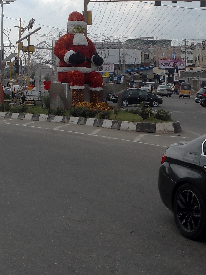 The image depicts the Ikeja City Mall Roundabout in Ikeja, Nigeria, under an overcast sky. A large, approximately 3-4 meter tall Santa Claus figure, constructed from red and white textured material with black gloves, boots, and yellow-green eyes, is centrally positioned on the roundabout's median. The Santa appears to be in a seated posture, surrounded by yellow and orange decorative foliage at its base. A metallic reindeer figure stands to the Santa's right, and a smaller, abstract decorative structure adorned with a red bow is to its left. The median is edged by black and white concrete curb blocks. The foreground shows an asphalt roadway, with the rear quarter of a dark grey sedan with black multi-spoke wheels visible to the right. In the midground and background, multiple vehicles, including a black sedan, a light-colored sedan, a yellow Keke Napep (auto-rickshaw), and a dark SUV, are present on the roadway, indicating active traffic. Overhead utility poles and wires are visible, some strung with decorative lights. Barbed wire is present on some background structures. Commercial buildings line the street in the distance, one featuring a billboard with "GOSHEN LAND" and "CROSS OVER" text, displaying a male figure's portrait. Distant human figures are vaguely discernible on sidewalks.