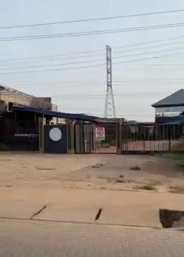 street scene on a sunny day. The camera is presumably mounted inside a vehicle, showing the view from the driver's side. The vehicle moves slowly along a paved road. There are buildings on both sides of the road, along with telephone poles and power lines. A tall transmission tower is visible in the distance. A worker in a green and orange jumpsuit is seen sweeping the side of the road. A silver car passes by. A sign with multiple business names is seen. A person in shorts walks along the side of the road.