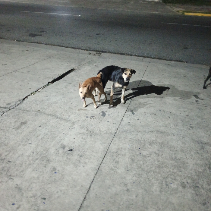 - "Two dogs stand on a concrete surface adjacent to a dark paved road" by FM-ALdt42, licensed under CC BY 4.0