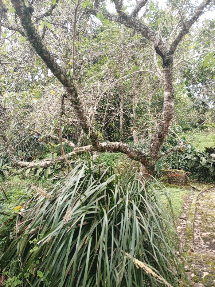 A dense, overgrown garden scene features a textured, branched tree with mottled bark as a focal point. Lush, long, green grass-like foliage clusters at the base of the tree. A partially visible, weathered stone path curves through the undergrowth. The background is a blur of green trees, hinting at a thick forest. A weathered stone structure is seen slightly behind the tree. The scene portrays a natural, somewhat unkempt, outdoor setting.