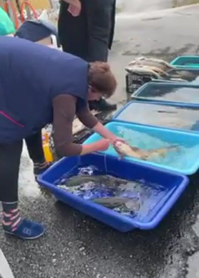 A woman in a blue vest and leggings is picking up a fish from a blue plastic bin with water and other fish in it. She is standing in front of a row of blue and turquoise plastic bins containing water and fish. Another woman in a black coat stands behind her. There is a black plastic crate next to the bins. An orange bottle and other items are on the ground. People are standing around. The scene takes place outdoors on a paved surface.
