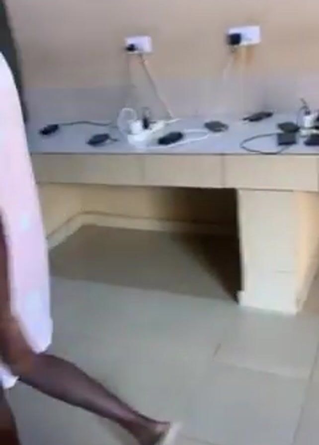 A young, dark-skinned person wearing a light pink, short-sleeved nightgown with white polka dots, and pink slippers, walks into a tiled room carrying a small, two-toned bucket with green and purple parts. They walk past a counter and out of view. The room has light-colored tiled floors and walls, and a partially visible counter. There are visible electrical outlets and wires on the walls, and a small black object on the counter.