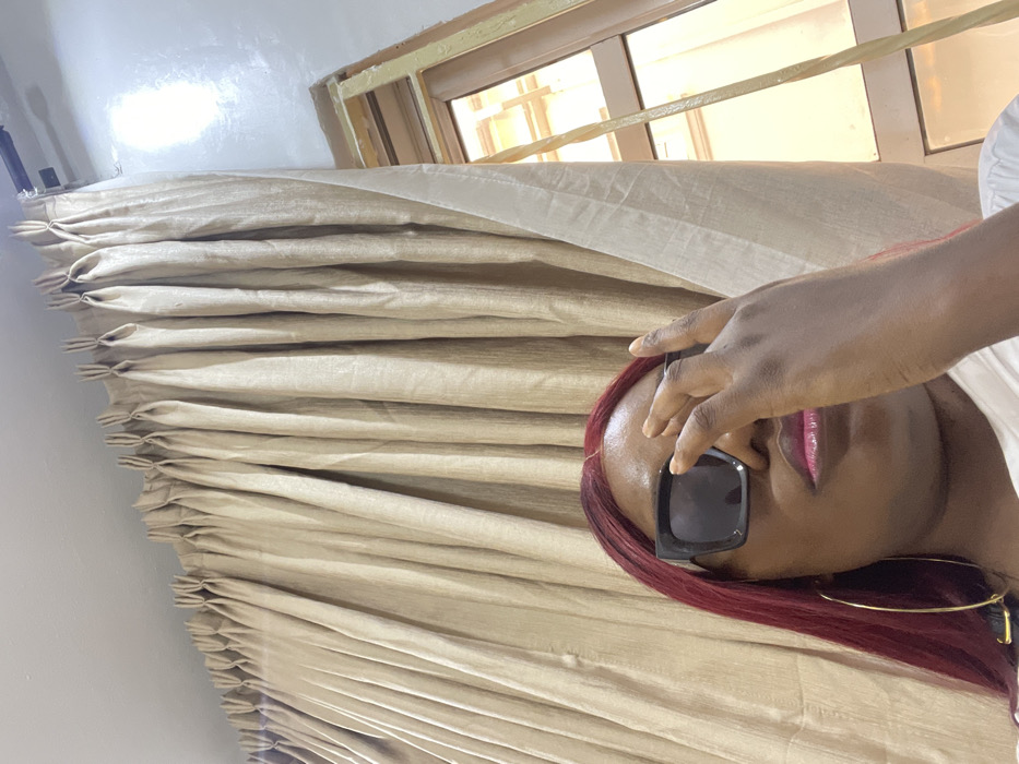 An indoor scene in Gwarinpa, Nigeria, depicts a person, presumed female, from the chest upwards. The individual has dark skin and long, straight, reddish-purple hair with a visible part. They are wearing a white garment, large gold hoop earrings, and black square-framed sunglasses. Pink lipstick is visible on the lips. The person's right hand is raised, with fingers positioned over the right lens of the sunglasses, appearing to adjust or touch them. The background features light beige or tan-colored pleated curtains, running from the top of the frame and extending downwards to the left and center. To the right of the curtains, a window with a light-colored frame is partially visible, with an inner sheer white curtain layer also present. Natural light enters from the window, and a reflection is visible on the wall above the window frame. A white ceiling is visible at the very top.