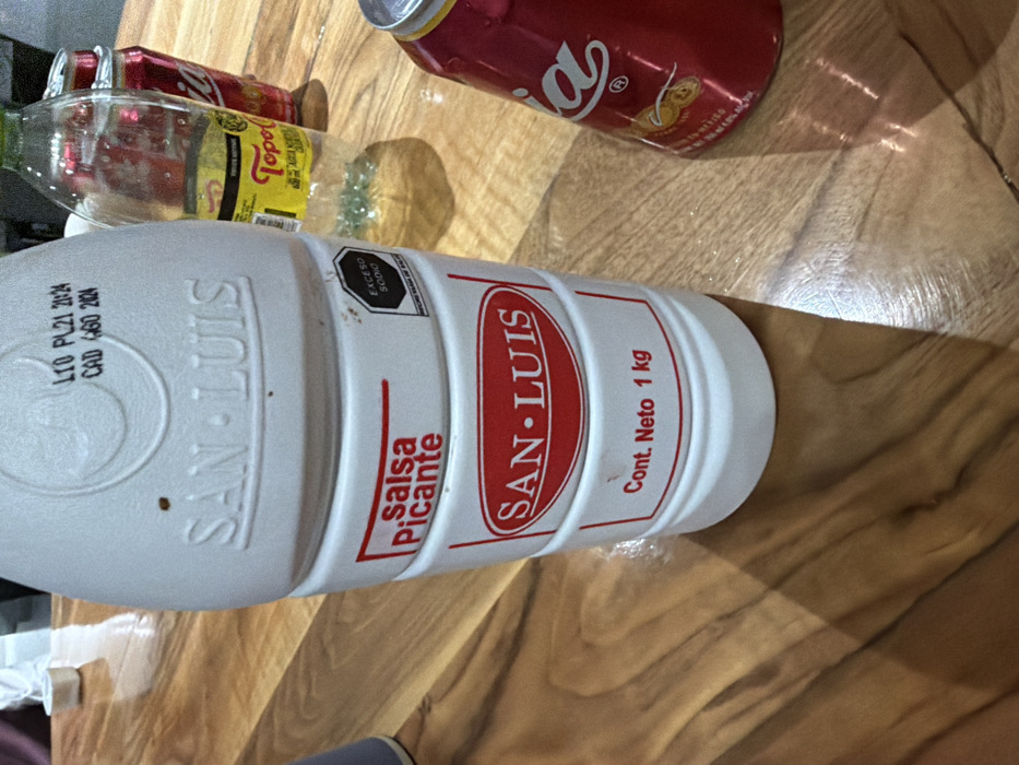 A white plastic container of San Luis Salsa Picante sits on a wooden surface. The label is red and white and includes the phrase "Cont. Neto 1 kg." Other bottles, including Topo Chico and Coca-Cola, are also visible on the wooden surface. Some text on the label is "110 PL21 21:24 CAD 660 2124."