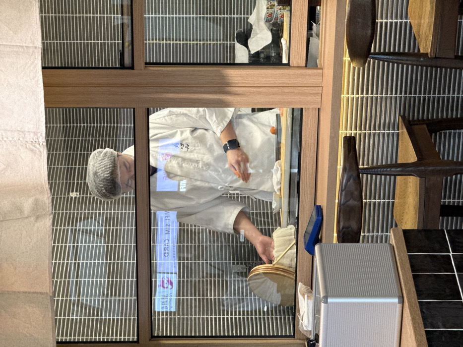 The image displays an interior view of a restaurant in Pudong, China, observed through a clear glass partition framed by light-colored wood. Behind the partition, a chef is positioned, wearing a white traditional chef's jacket adorned with embroidered characters on the left chest, a white face mask, and a light grey hairnet. A dark smartwatch is visible on the chef's left wrist. The chef's hands are actively engaged in food preparation; the right hand holds a small, orange-colored food item, possibly fish or roe, over a white cutting board. Another similar orange food item is present on the cutting board. To the chef's left, a circular wooden lid rests atop a white cloth-covered container. The background behind the chef consists of horizontal slatted blinds. In the immediate foreground, on the viewer's side of the partition, a silver rectangular device and a blue payment terminal are situated on a dark wooden counter. Reflections on the glass partition include inverted text, notably "CARD MIS SIM." Two wooden dining chairs are partially visible below the counter.