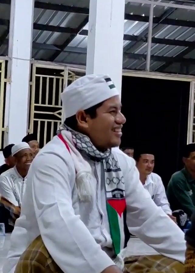 The video features a man seated among a group of people in what appears to be an indoor gathering or event. The man is wearing a white shirt, a white cap, and a scarf with the Palestinian flag colors of red, green, and black. He is smiling and appears to be engaged in conversation or listening to someone speaking. The people around him are also mostly men, some wearing similar white caps. The background suggests an indoor space with a metal roof and open windows. The lighting appears to be artificial.