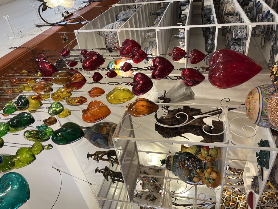 A low-angle shot showcases an eclectic display of decorative items. Hanging from above are multiple strands of glass heart ornaments, transitioning from red to orange, yellow, and green. Below, mirrored shelves hold sculptures, vases, and ceramic pieces. Plates are arranged in rows on shelves toward the upper portion of the image. The angle emphasizes the depth and variety of the collection.