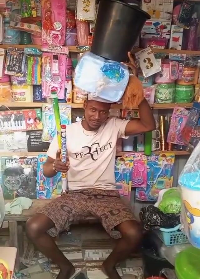 A man sits on a low wooden bench in a small, cluttered store filled with toys and household goods. The store is brightly lit with natural light and the shelves are packed with colorful items. The man is wearing a light-colored t-shirt with the word "PERFECT" printed on it, and patterned shorts. He has black sandals at his feet. He balances a black bucket, a package of bottled water, and a brown duster on his head, and holds a colorful toy gun in his right hand. He looks towards the camera with a smile and raises his arms.