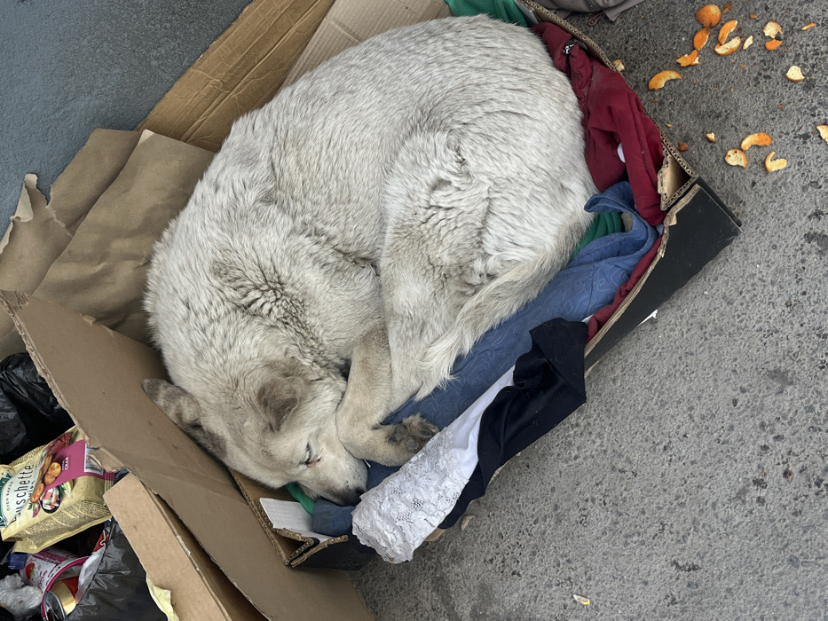 A large, light-colored dog is observed sleeping, curled tightly, within a damaged cardboard box. The dog, predominantly off-white to pale grey in fur, rests its head on its paws; a small reddish mark or scab is visible near its left eye. Inside the box, serving as bedding, are several pieces of crumpled fabric including white lace, black, blue, and red cloth. Adjacent to the dog, within the box or nearby, are discarded items including a black plastic bag, a crumpled brown paper bag, a silver can, and a clear plastic package of "Bruschette" crackers. The cardboard box sits on a grey concrete or asphalt surface. Scattered on the ground to the lower right of the box are numerous pieces of orange peel. A small yellow piece of debris is present on the concrete to the left. The scene is located in an unspecified outdoor urban environment in Shumen, Bulgaria.
