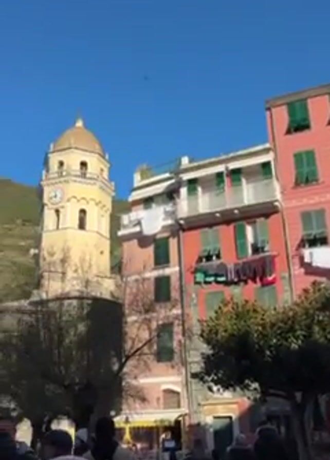 The video pans across a harbor scene in a European village. It begins with a view of colorful buildings in the background, featuring a red building with green window shutters and a yellow building with brown shutters. Laundry is hanging out to dry on the red building. The camera pans to reveal a yellow church steeple with a clock, set against a green hillside. Then, the camera shows a view of the harbor, with a cement walkway, trash receptacles, and a lamp post in the foreground. Further away, a breakwater is visible, with a number of people standing on it. Various boats are docked in the harbor. The backdrop of the harbor includes a mountainous landscape. The sky is clear and blue.