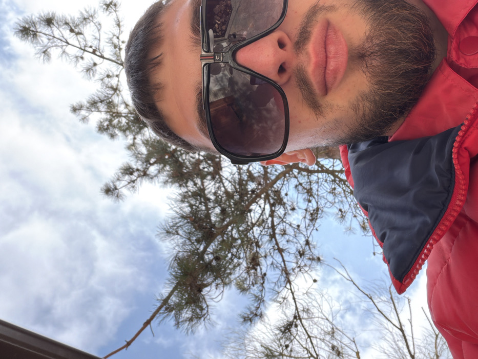 A male individual is depicted in a close-up, low-angle outdoor selfie