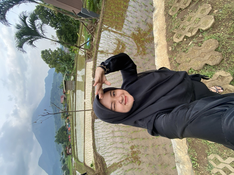 A female subject, appearing in a selfie, is positioned in the foreground wearing a black hijab, a black long-sleeved shirt, and dark flip-flops