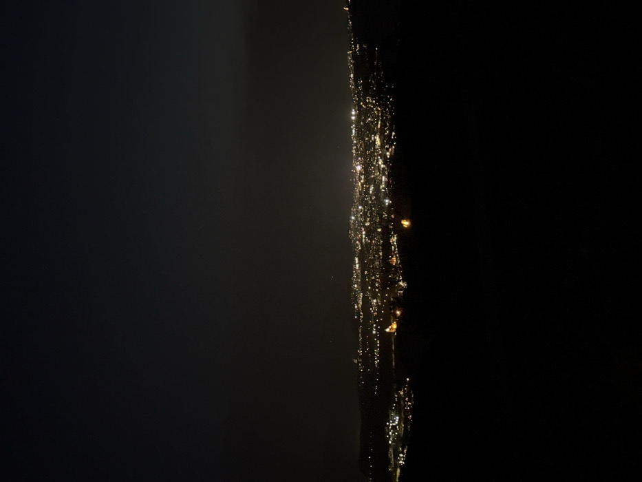 The scene is a panoramic night view captured from an elevated position within Arbanassi, Bulgaria. A dark, uniform night sky occupies the upper two-thirds of the vertical frame. Below this, across the mid-ground, the distant city of Veliko Tarnovo is visible, its urban spread defined by numerous white, yellow, and orange artificial lights. These lights cluster densely, indicating residential, commercial, and infrastructural development. Individual structures are indistinct due to distance and ambient darkness, but the patterns suggest a network of streets and developed areas. The lower third of the image consists of a solid black, undifferentiated silhouette of intervening landscape or terrain, obscuring the immediate foreground. No persons, vehicles, or specific foreground objects are identifiable. The environment is dark, suggesting a clear night with no visible moon or prominent celestial bodies.