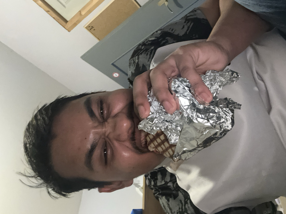 - "A person is shown in an indoor setting, eyes squinted and face contorted in apparent discomfort as they eat a pastry wrapped in aluminum foil" by FM-txt2A3, licensed under CC BY 4.0