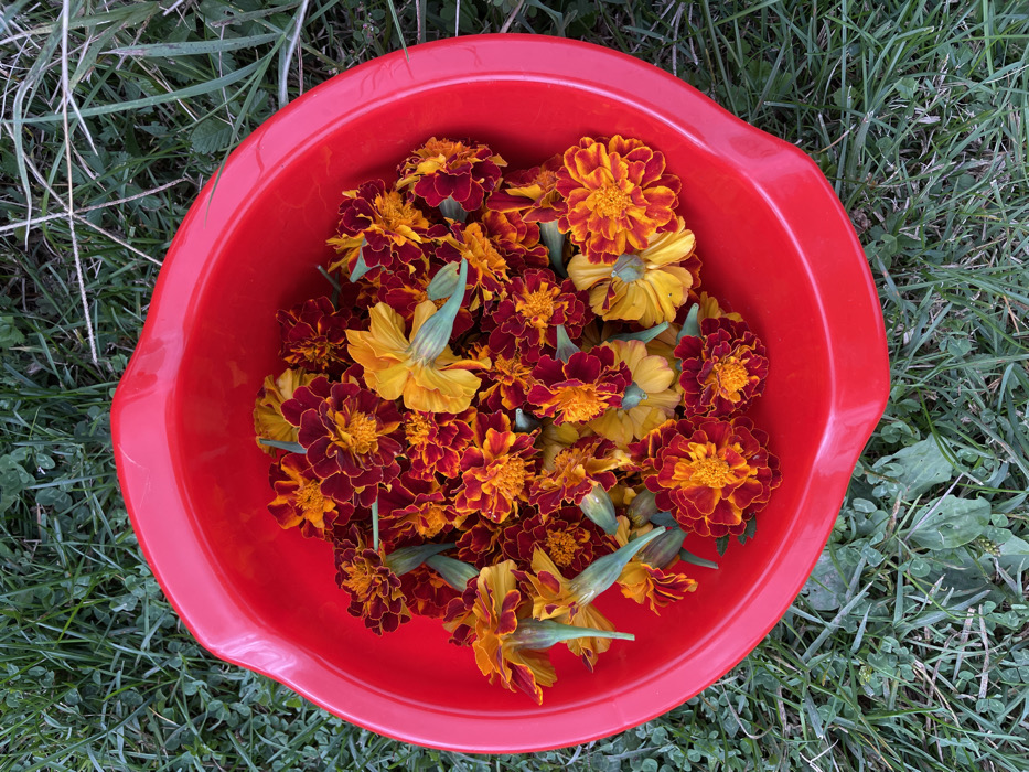 A red plastic bowl, approximately circular with two subtle handles, is positioned on a patch of green grass. The bowl contains a collection of freshly picked marigold-like flowers. These flowers display bicolored petals, predominantly deep reddish-brown at the outer edges and bright yellow or orange towards the center. Several flowers are primarily yellow or orange. Many individual flowers retain short, light green stems and calyxes. The grass beneath and surrounding the bowl consists of various green blades, including some broader-leafed plants. The scene is located in Danilovgrad, Montenegro.