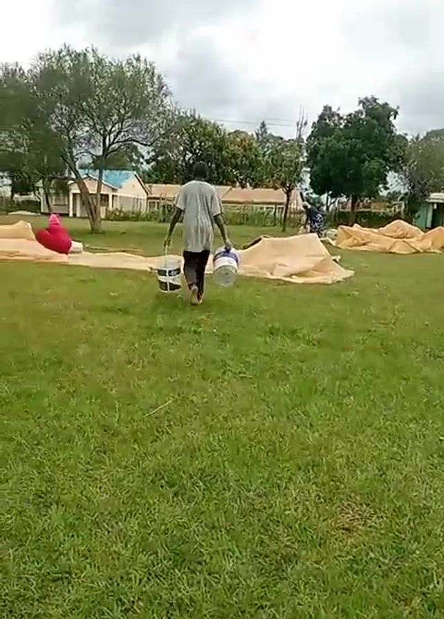 A man is walking across a grassy field, carrying two white buckets. He is heading toward several tan tarps spread out on the grass. In the background, there are trees and houses. Another person, wearing a red shirt, is kneeling on one of the tarps. Another person is standing near another tarp further away. The sky is overcast.