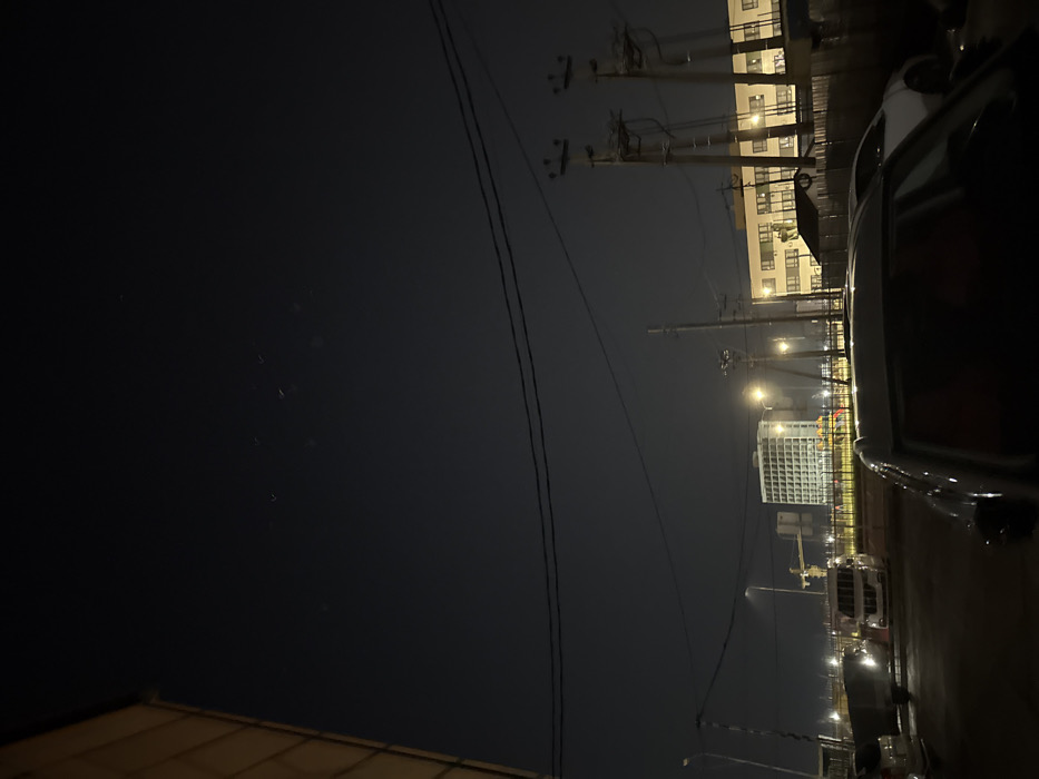 This image depicts an exterior nighttime scene in Yablonovskiy, Russia. The sky, occupying the upper two-fifths of the frame, is dark and clear, with several faint, indistinct V-shaped light reflections or objects discernible in the upper-mid section. In the foreground, a partial view of a light-colored building facade is visible vertically along the extreme left edge. An asphalt or paved surface, appearing somewhat reflective, occupies the lower portion of the image. Several vehicles are parked: a dark-colored vehicle (likely an SUV or large sedan) is in the immediate foreground, partially obscuring a lighter-colored car behind it to the right; a white commercial van is positioned left of center; and a dark truck with an attached flatbed or trailer is parked further to the left. The mid-ground is characterized by a network of utility poles and dark power lines spanning horizontally across the scene. Multiple streetlights are active, illuminating portions of the road and vehicles. In the background, a prominent multi-story, light-colored building with a grid-like pattern of windows is visible towards the left. To its right, a lower, cream-colored building with numerous lit windows is present. A yellow construction crane is discernible behind the white van, positioned near the base of the tall grid-patterned building. Below this tall building, colorful structures consistent with playground equipment are partially visible. A dark fence or barrier runs horizontally across the middle distance, separating the foreground from the background structures. Various other distant artificial lights punctuate the background, suggesting further urban development. No individuals are visible, and no dynamic actions or interactions are depicted.