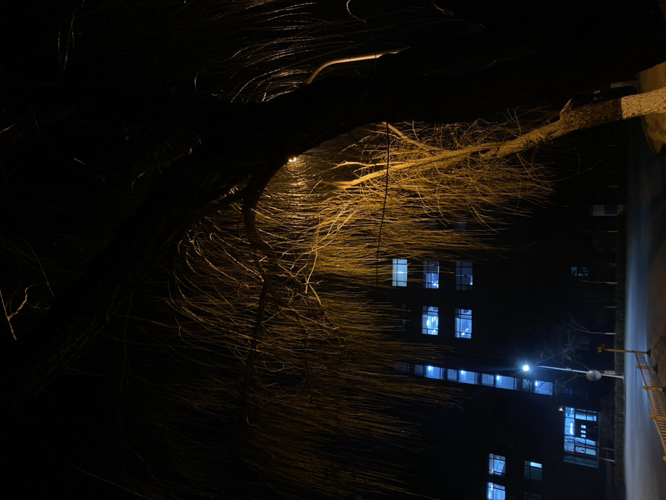 The image depicts a nighttime outdoor scene in the city of Zhongtun, China. A large tree with a dark trunk and numerous bare, thin, drooping branches occupies the right and upper portions of the frame. These branches are illuminated with a warm, orange-yellow light emanating from a visible streetlamp positioned within the tree's canopy. The lower portion of the tree's trunk exhibits a section painted white. In the background, a dark, multi-story building stands, featuring multiple windows across at least five visible floors, all emitting a distinct cool blue light. A vertical strip of similarly blue-lit windows is visible on the left side of this building. A second, blue-emitting streetlamp is positioned in the mid-ground on the left, illuminating a dark, paved road or parking lot. A low, yellow-painted barrier runs along the edge of this paved area in the lower left quadrant. The scene appears uninhabited.