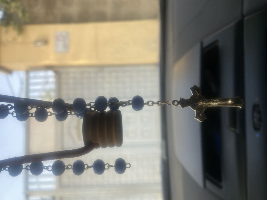 A rosary with blue beads and a metallic cross hangs against a blurred background