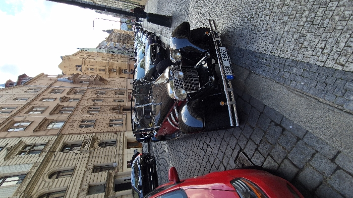The image displays a street scene in the Capital City of Prague, Czechia. A two-tone vintage-style convertible car, primarily black/dark blue with red side body panels, is prominently parked on a cobblestone street in the mid-ground. It features a chrome grille, dual circular headlights, a chrome front bumper, and a Czech license plate "3SK 9652" affixed to the bumper. The front-left section of a red modern vehicle is visible in the extreme foreground on the left. Behind the vintage car, a line of several modern vehicles, including dark-colored SUVs, are parked along the right curb of the street. The street surface consists of varied grey cobblestones, with a lighter grey concrete strip forming the edge of a pedestrian area on the right. A black lamppost or utility pole stands on the right sidewalk. Multi-story historic buildings with ornate facades, decorative windows, and balconies line both sides of the street. The building on the immediate left features a light-colored facade. Further down the street, buildings display various architectural styles, including pitched roofs and tower elements. Faint human figures are discernible in the distance: one on the right sidewalk and others further down the street on the left. The sky above the buildings is bright with some cloud cover.