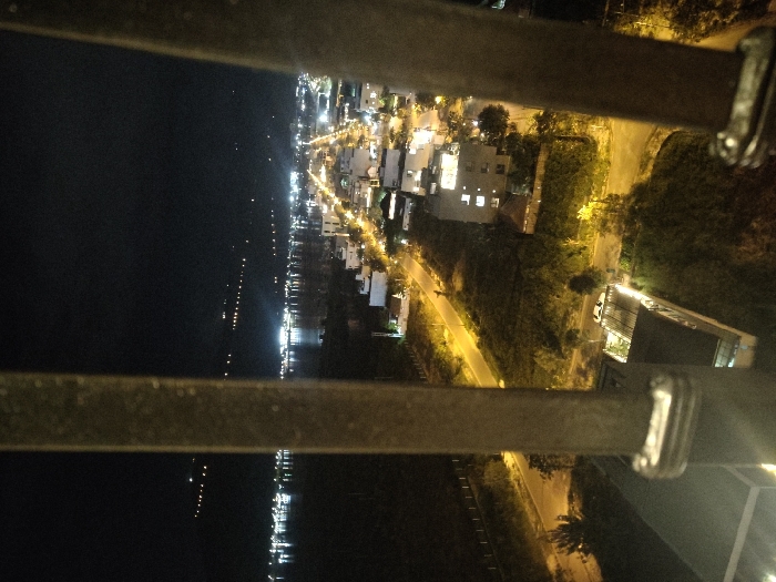 The image displays an elevated nighttime view of a coastal urban environment within Sơn Trà Ward, Vietnam. The foreground is partially obscured by two dark, vertical structural elements positioned on the left and right, with a metallic clasp visible on the left element. The visible landscape encompasses a network of illuminated roads, bordered by numerous multi-story buildings and interspersed with dark vegetated areas. A prominent body of water, reflecting multiple artificial lights from the shoreline and what appear to be distant marine vessels, occupies the mid-background. Beyond the water, a dark landmass, likely a mountain or peninsula, is visible, marked by distinct rows of ascending lights. A white vehicle is parked on a rooftop terrace of a building in the lower-mid left. No individuals or specific actions are discernible.