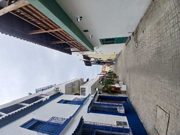 A narrow street view features buildings with contrasting architectural styles. One side showcases a white building with blue window frames and railings, while the opposite side has a building with a dark, wooden, and covered roof. The street, paved with gray brick, recedes into the distance. The sky is overcast.