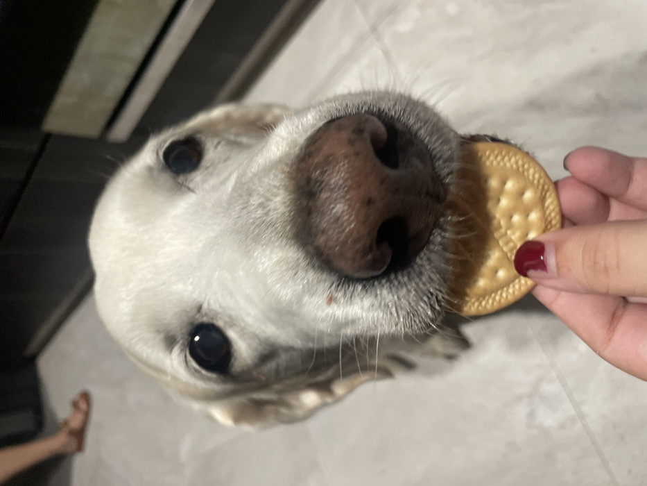 An indoor scene in Coatzacoalcos, Mexico, depicts a close-up of a light-colored dog, likely a Golden Retriever or similar breed, with its snout partially obscuring the lower frame. A human hand, with a dark red manicure, holds a round, light-brown cracker to the dog's mouth. The dog's dark eyes are visible and focused towards the viewer. In the blurred background, a person's foot wearing a brown sandal is partially visible on a light-colored tiled floor. Dark cabinetry or furniture is also present in the indistinct background.