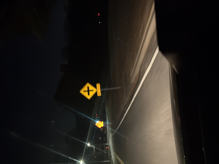 A dark and blurry image depicts a road at night. A yellow diamond-shaped road sign with a black cross inside, indicating a crossroad, is visible on the left side of the road. Another similar sign appears smaller further down the road. The road has a white line marking the edge. The right side is largely dark, showing part of a vehicle's interior.