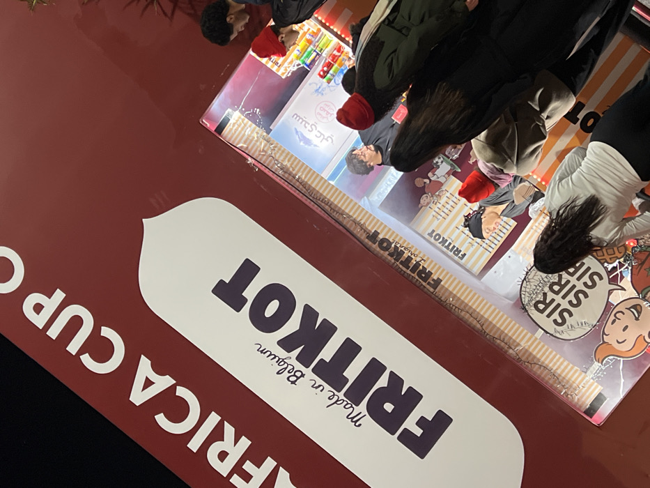 The image showcases a "FRITKOT" food stall, promoting its Belgian origin. The stall design includes the text "AFRICA CUP" and "FRITKOT L'original." A customer queue is partially visible, with individuals wearing red hats and dark jackets. The word bubble says SIR SIR and there is some Arabic writing next to a drink name, "سيدي علي". The stall is decorated with promotional images and possibly a beverage display. The general atmosphere seems lively and festive.