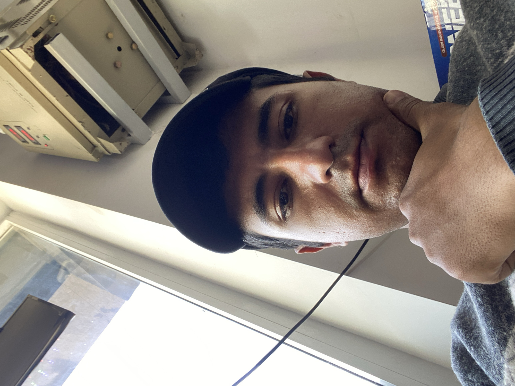 A man with short dark hair, wearing a black baseball cap and a gray sweater, is looking directly at the camera. His right hand is raised to his face, with his fingers touching his cheek. He is positioned near a window with bright daylight streaming through. In the background, a boxy, beige-colored electronic device is mounted near the ceiling. The location is not identifiable as Bukhara, Uzbekistan, based on the provided image.