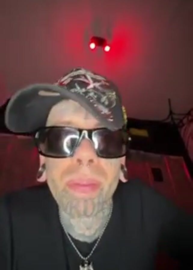 A person with extensive face tattoos, wearing sunglasses and a baseball cap, is seen from a low angle