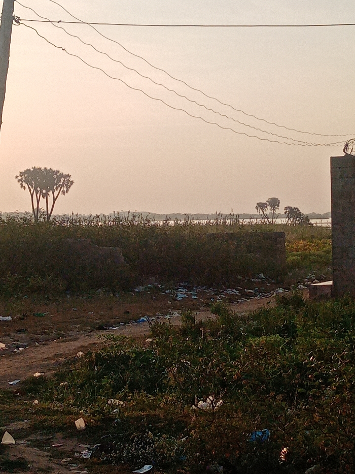 This image depicts an outdoor scene in Dabawa, Nigeria, under a hazy, pale sky. In the immediate foreground, a dirt path or uneven ground is visible, heavily littered with various pieces of refuse, primarily white and blue plastic bags and wrappers, scattered among sparse green vegetation and bare soil. To the far left, a dark utility pole is partially visible, extending upwards. To the far right, a concrete or stone pillar-like structure is partially visible. Mid-ground features a dense band of green foliage and bushes, obscuring parts of the terrain. Behind this foliage, a horizontal expanse of water is discernible, reflecting light and appearing to be a lake or large river. Beyond the water, several trees are silhouetted against the hazy sky; a distinct cluster of palm-like trees stands on the left, and smaller, less defined trees are visible further right. The upper third of the image shows a pale, uniform sky, possibly indicating dawn or dusk, or atmospheric haze. Three dark, wavy electrical or communication lines stretch horizontally across the sky, originating from the left side, potentially connected to the utility pole, and extending towards the right, passing above the distant trees and the pillar on the right. No people or animals are visible.