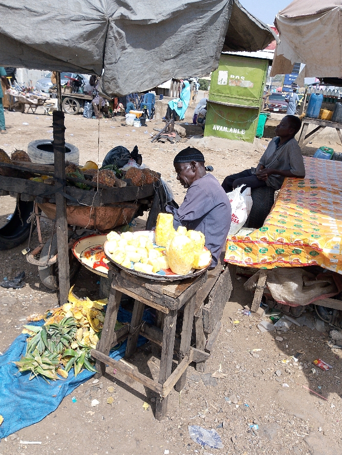 Under a large umbrella, an older man wearing a cap sits preparing pineapples. He places chunks on a metal tray atop a small, weathered wooden stool. Discarded pineapple peels lie on a blue tarp nearby. To the right, a young man lounges on a table covered with a colorful patterned cloth. The scene is an outdoor market, with a general store box and various goods visible in the background. The ground is bare and littered with trash.