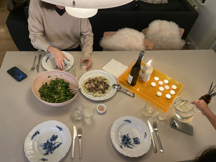An overhead view captures an indoor dining setting within a private residence in Copenhagen, Denmark. A light grey table is arranged for a meal. At the upper left, a person, wearing a light beige long-sleeved sweater, is seated, with their right hand extended towards a white bowl featuring a blue floral pattern, while their left hand holds a clear glass. A dark-colored smartphone is positioned face up to the left of their setting. Adjacent to the person, a large pink bowl holds green salad with serving tongs. A white plate contains a dish consisting of a creamy base topped with sliced mushrooms and what appears to be poultry or seafood, accompanied by a silver spoon. In the upper right quadrant of the table, an orange translucent rectangular tray holds twelve lit tealight candles, a lit white ceramic oil lamp, and a bottle of white wine. A folded white napkin is also present on the table. Towards the lower right, a second person's hand is visible, holding a clear pitcher filled with water and lemon slices. A silver-colored smartphone rests face down near this pitcher. A place setting below the orange tray includes a white plate with a blue floral pattern, a knife, and a fork. In the background, a dark sofa is visible, adorned with two decorative pillows shaped like sheep, covered in white faux fur. Overhead lighting, partially visible, illuminates the scene.