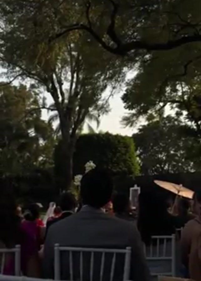 A wedding ceremony is in progress. The view is from behind the seated guests. Most are facing forward. Trees surround the outdoor area. An umbrella is partially visible to the right. The sky is visible through gaps in the trees.