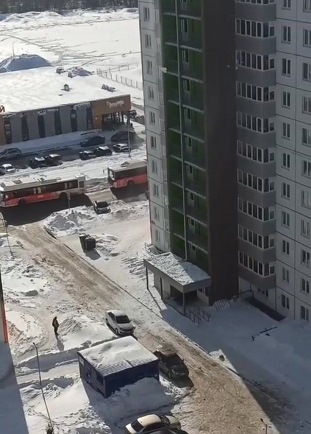 high-angle view of a snowy urban scene on a sunny day. A tall, multi-story apartment building dominates the right side of the frame, with a mix of white, grey, and green panels. At the base of the building is a covered entrance. Suddenly, a large amount of snow falls from the roof of the building onto the entryway below. In the foreground, there's a parking area covered in snow with several cars parked. Across the street, there's a single person walking on a snowy path. Further back, another building is visible with several parked cars in front of it. A bus can be seen near the building. The overall impression is of a residential area in the winter, with clear skies and bright sunlight. The snow falling from the building is the main action taking place.