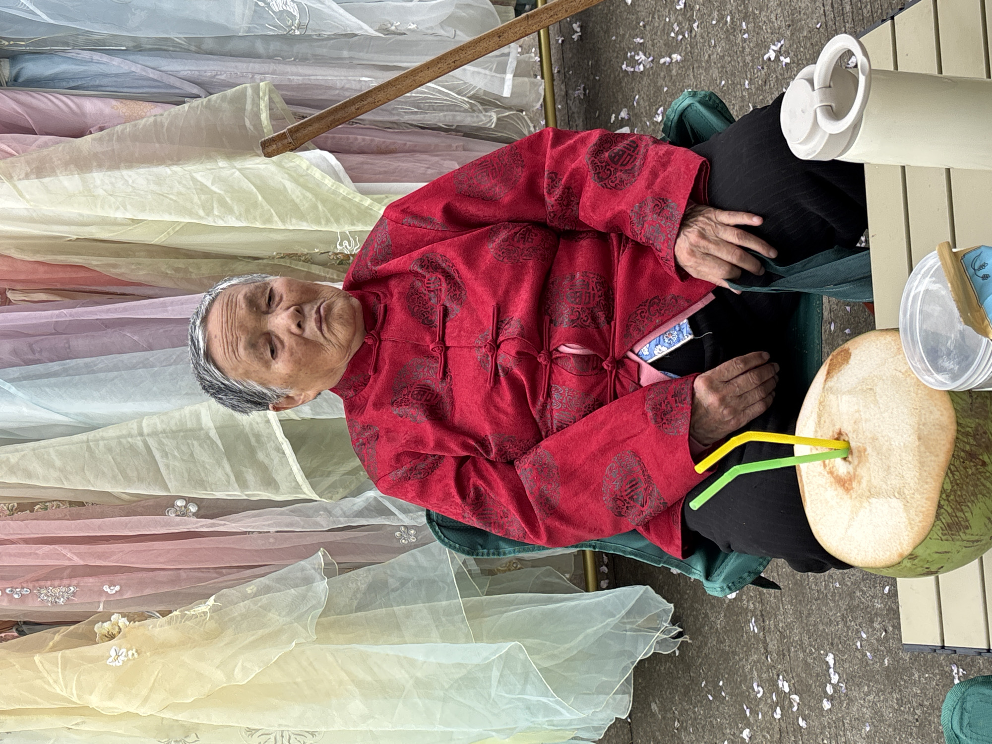 An elderly Asian woman sits at a table outdoors in Xianfeng, China. She wears a traditional red jacket with dark patterned detailing and black pants. The table is partially visible, and on it is a halved coconut with two straws and a plastic container. The woman’s hands are resting on her lap. Behind her, a collection of light-colored, sheer fabrics is draped, suggesting a market or textile display. The ground is concrete, and scattered white flower petals are visible.