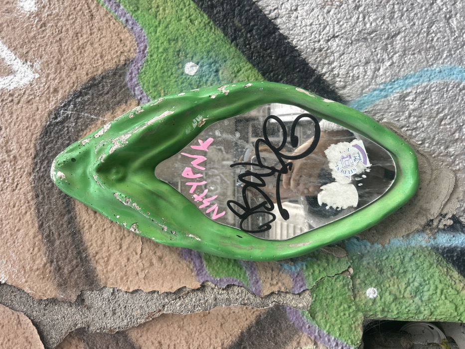 - "A green, elongated, pointed oval-shaped mirror is mounted on a heavily graffitied and textured wall in Belgrade, Serbia" by FM-roYbc2, licensed under CC BY 4.0