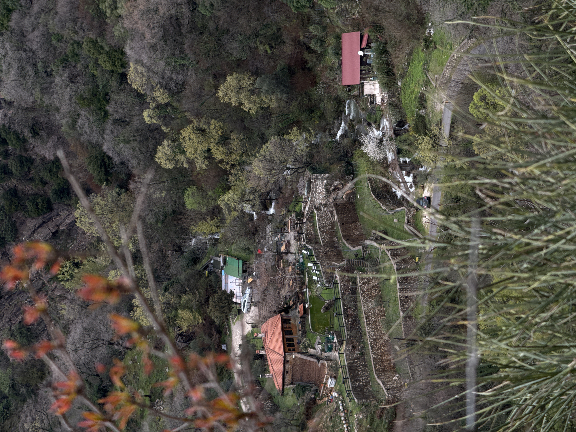 An aerial-perspective image depicts a vegetated valley in Krapina, Montenegro, characterized by steep, forested slopes and a river flowing through its base. The foreground is partially obscured by blurred branches showing nascent red-orange foliage and green stalks. The scene features several man-made structures integrated into the natural environment. On the mid-left, a multi-story building with a prominent terracotta tile roof and stone construction is visible. Surrounding this building are an artificial pond or pool, an outdoor seating area with multiple tables and white chairs, and an array of white beehives. Descending from this complex are tiered stone-walled terraces, featuring cultivated green plots and pathways. Upstream and to the right, a smaller building with a red gable roof and a white satellite dish on its roof is positioned directly adjacent to the river. The river itself contains visible cascades and rapids, and at least two small bridges span its width, connecting different banks. A narrow, paved road winds through the valley, passing near the lower building and a dark-colored sedan. Further up the slope, behind the main building, a light-colored station wagon is parked near several white and green temporary structures, adjacent to a red flag. The dominant vegetation includes a mix of deciduous trees, some with sparse, light green spring foliage, and darker green evergreens. No individuals are visible within the frame. The overall light suggests an overcast day.