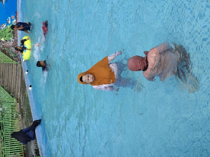 The scene takes place at a swimming pool in Kecamatan Tulung, Indonesia, located at the coordinates -7.592 latitude and 110.65 longitude. A woman wearing a hijab, a long-sleeved shirt, and a headscarf is standing in the water in the middle of the pool, facing the camera. Another woman wearing a headscarf is swimming near her, facing away from the camera. A man is swimming towards the left side of the pool. A woman is sitting on a yellow inflatable ring in the pool in the background. A man is standing next to the pool. There is a woman sitting on the side of the pool in the background. The pool is blue and surrounded by a concrete deck. There are stairs leading up to the pool on the right side of the image.