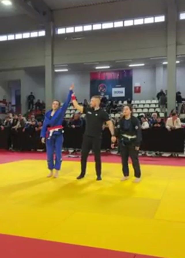 end of a Judo or Jiu-Jitsu match. Two female competitors stand on a yellow and red mat, one in a blue gi (uniform) and the other in a black gi. An official in a black shirt stands between them. The official raises the hand of the woman in the blue gi, indicating her as the winner. She looks pleased and acknowledges the crowd. The woman in the black gi stands calmly. The event appears to be taking place in a large indoor sports hall or gymnasium, with spectators visible in the background behind a barrier. Banners and branding can be seen on the walls, including the word "RODA." The lighting in the hall is bright and artificial.