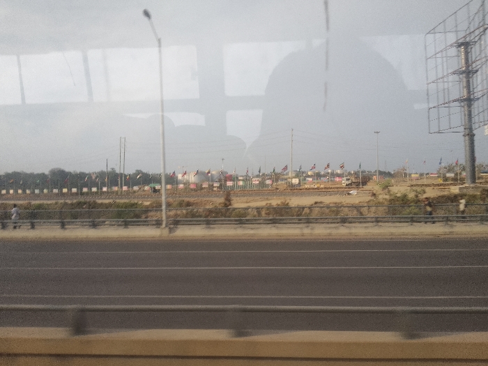 A roadside scene features a multi-lane highway with a barrier. Beyond the barrier, a wide, sandy area hosts numerous flagpoles with flags fluttering atop them. Further back, large, white, domed structures are visible. The sky is overcast, and light poles and an advertising tower punctuate the horizon. The image appears to be taken from inside a moving vehicle, evidenced by window reflections.