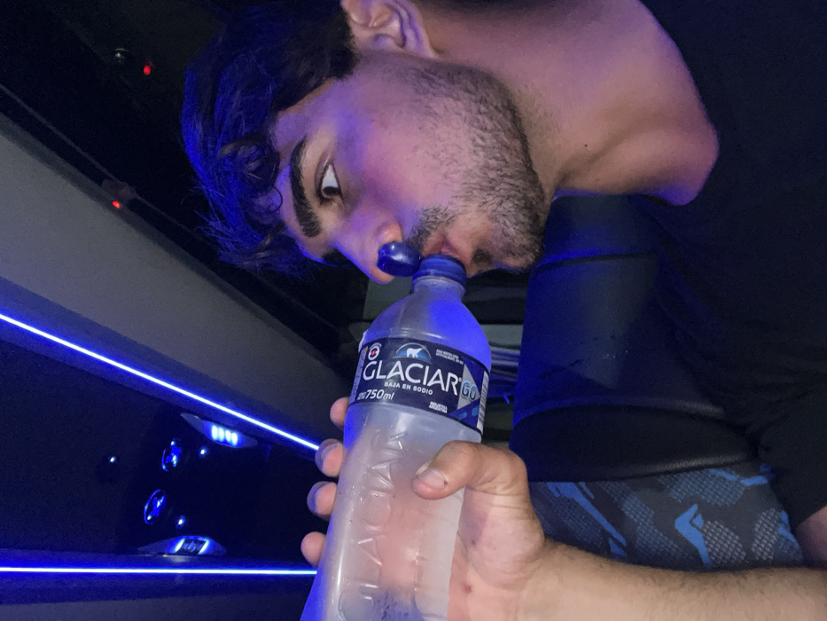 A man is drinking from a water bottle labeled "Glaciar." He has dark hair and a beard. The surroundings are dimly lit with blue LED lights, suggesting a car interior. The man is wearing a dark shirt and patterned underwear. The perspective is slightly tilted upwards.