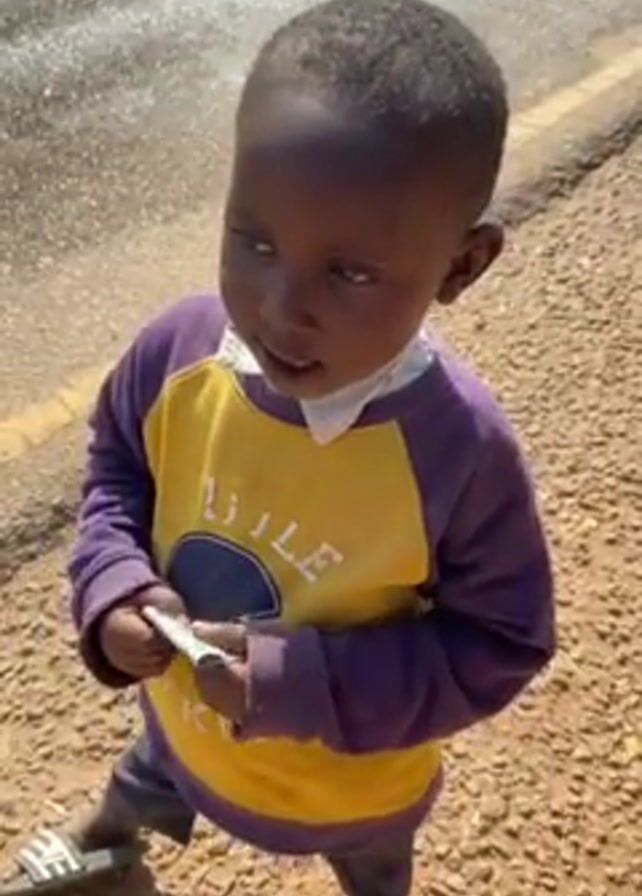 A toddler is standing outside near a road, holding a small object in his hands. He has dark skin, short hair, and is wearing a purple and yellow long-sleeved shirt, striped pants, and slides. He looks upwards as someone off-camera asks him what he wants to buy. He responds "Dino Konnie". The ground is dirt.