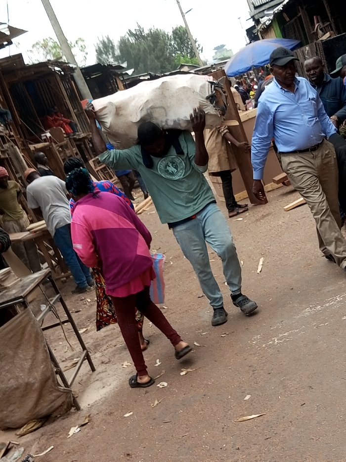 The image depicts a bustling outdoor market or informal commercial area, consistent with locations such as Gikomba Market in Nairobi, Kenya. The scene features an unpaved, reddish-brown dirt pathway, heavily trafficked by pedestrians and scattered with wood offcuts and debris. In the central foreground, a dark-skinned male, wearing a light teal t-shirt with a graphic, light blue jeans, and dark clogs, carries a large, white, irregularly shaped sack on his left shoulder and head, securing it with his left hand as he walks towards the right. Adjacent to him, a dark-skinned female, dressed in a two-toned pink and magenta long-sleeved top, dark leggings, and sandals, walks away from the viewer, carrying a light blue and white striped reusable bag in her right hand. To the right of the central figure, a dark-skinned male, wearing a light blue collared shirt, khaki trousers, and a dark baseball cap, walks towards the right, appearing to observe the surroundings. The background is populated by numerous other individuals and informal structures. On the left, a man in a light grey t-shirt stands near a wooden workbench. Behind the central figures, another man in a brown garment carries a large, flat wooden object. Various makeshift stalls and workshops, constructed from wood planks and corrugated iron sheets, line both sides of the pathway. A blue umbrella provides shade over a distant vendor's spot. Trees are visible above the structures in the mid-distance under an overcast sky. The overall scene indicates active commerce and daily life within an informal urban marketplace characterized by carpentry and general trade.