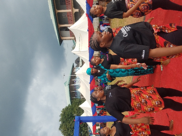 This image depicts an outdoor event in Alor, Nigeria, under a dark, overcast sky. In the foreground, a group of approximately eight young women, primarily visible from the waist up, are positioned on a red carpet-like surface. They are uniformly dressed in black t-shirts, black leggings, and red-orange patterned fabric wraps tied around their waists. Some individuals are barefoot. Text like "Casablanca" and "7G" is visible on their t-shirts. An adult woman, wearing a long, patterned teal-blue dress and a matching headwrap, stands slightly behind the group, observing them. In the mid-ground and background, multiple white canopy tents with red and blue fabric accents are erected. Behind these tents, two multi-story buildings with light green roofs are visible. Green trees are present on the far left, and a light pole stands between the buildings. White and red chairs are arranged under the tents, indicating seating for an audience or participants. The young women appear to be engaged in an organized performance or procession.